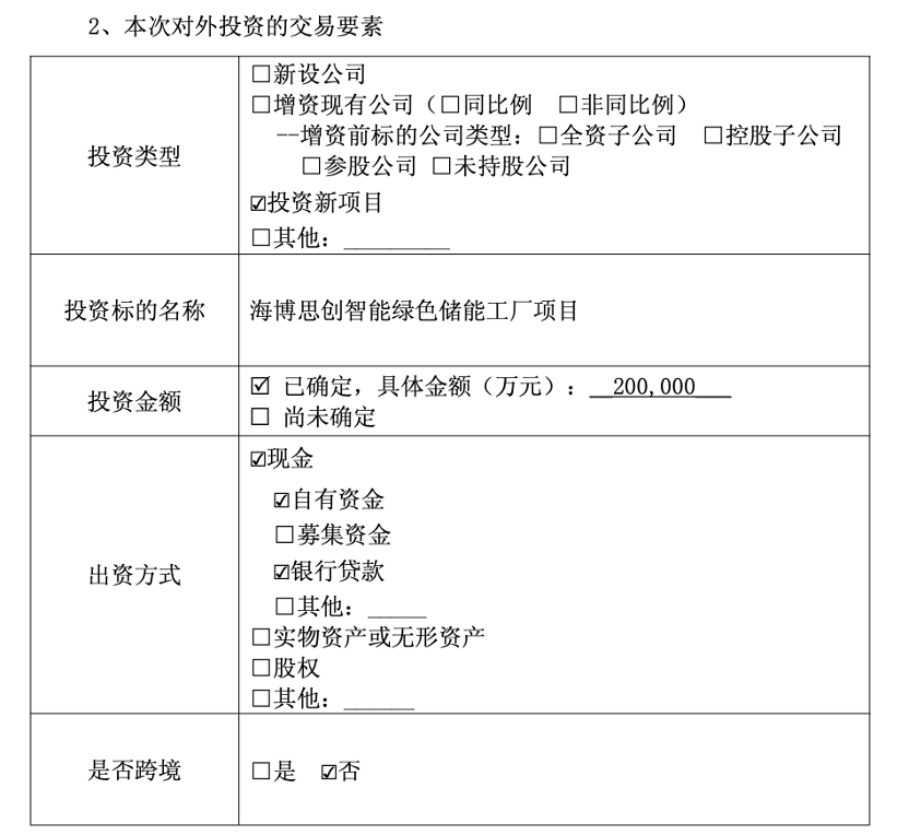 海博念念创示意,这次对外投资相宜国度产业政策导向及公司举座发展计策,是公司主理储能行业发展机遇、沉着和普及行业进阵势位的紧迫计策举措。阵势建成后,将有用补没收司改日业务发展面对的产能缺口,普及供应保险智商与反馈速率。通过引入先进的智能化制造体系,普及出产效果、优化居品资本结构,从而增强公司居品的概括竞争力。